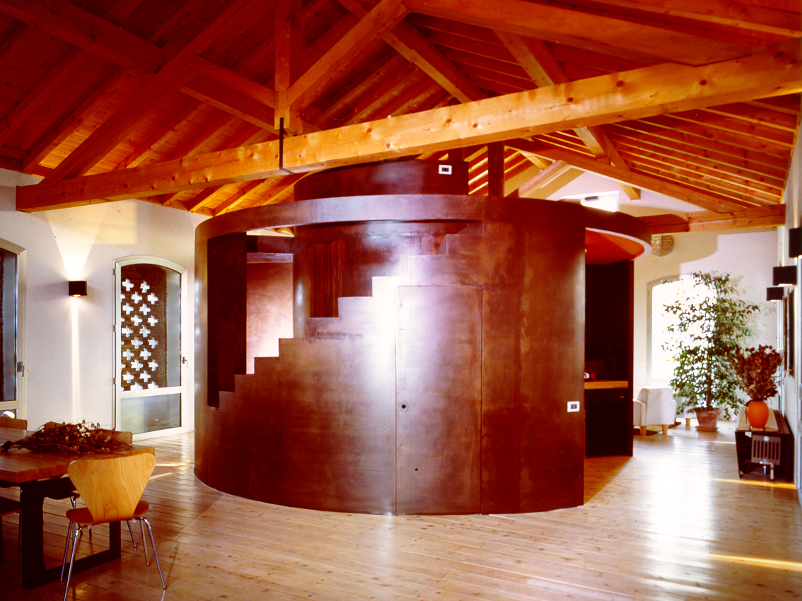 Erbusco BS Clienti: Campana Giacomo e Cristina Barbieri Programma: Restyling di un edificio agricolo per divenire un abitazione unifamiliare con grande volume centrale in corten del diametro di 5,30m. Cronologia Progetto: 1993 Lavori: 1994 Sup. Lotto: 6.000m2 S.U.: 250m2 Volume: 1280m3 Budget: 250.000,00€ Categoria:houses.interior.restyling. |