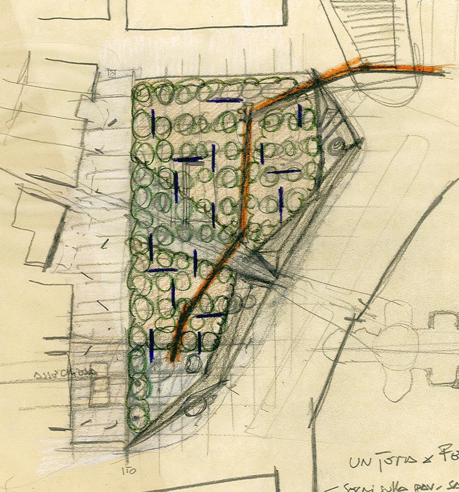caratteri e ragioni d’intervento a partire dai caratteri della città. 2- Peschiera, città di transito e turistica,vede nella Piazza della Rocca uno spazio “scambiatore” tra le attività commerciali inserite nel tessuto storico e i percorsi verso l’esterno. Il progetto assume quindi la complessità tipologica dello spazio pubblico secondo un criterio di riproporzionamento e riarticolazione volto a conferire nuova e più estesa praticabilità alla Piazza Ferdinando di Savoia. 3- La forte suggestione creata dalla darsena e dalla vista, che si ha di questa verso la fabbrica delle caserme, ha innescato un procedimento compositivo di completamento e rafforzamento dello storico manufatto del ponte dei voltoni. Una grande gradonata in mattoni è innestata a connessione con il percorso dei “voltoni” così da essere allo stesso tempo risalita e luogo scenico per le manifestazioni che si svolgono sulla darsena. La gradonata si pone inoltre come elemento urbano in relazione con la collina artificiale, a piani erbosi salienti, posta sopra i voltoni come conclusione al disegno complessivo della piazza. In questo punto gli elementi progettuali generatori dei percorsi si condensano in un'unica immagine per riassumere il carattere della piazza come luogo di cerniera tra interno ed esterno, la strada ed il ponte, la gradonata ed il pontile aereo che spuntando dalla chioma degli alberi raggiunge gli spalti. La piazza così pensata diverrà collettivamente un’esperienza reale del vissuto urbano, spazio per nuova conoscenza della città e luogo di memoria nell’immaginario comune estendendo i percorsi del centro storico verso le mura ed il paesaggio del lago e del fiume. |